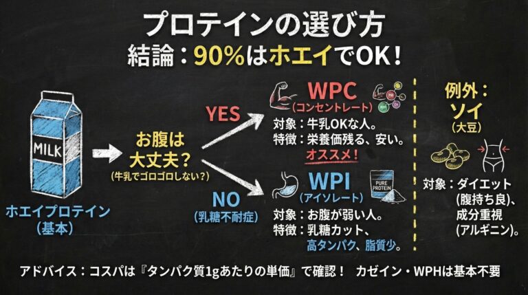 プロテインには大きくわけてホエイ、カゼイン、ソイの3種類のプロテインがあります。カゼインやソイは吸収が遅く味もドロドロしていて美味しくないものが多いのでプロテイン初心者はホエイプロテインをオススメします。また、ホエイプロテインにもWPCとWPIという分類がありWPIは乳糖が取り除かれているので乳糖不耐症の方でも安心して飲めます。